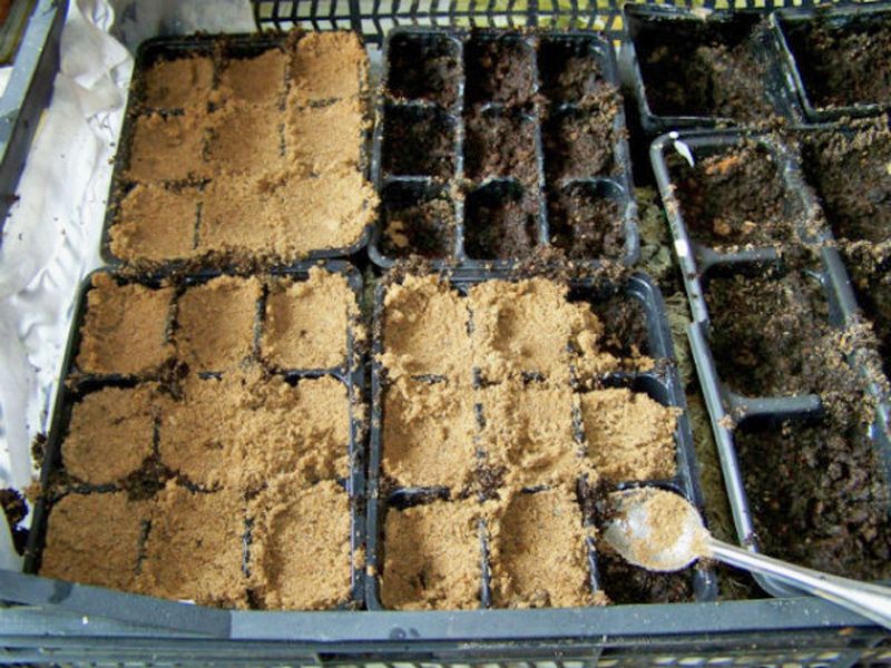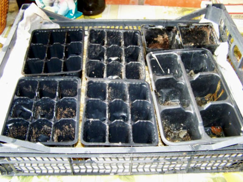 Ящик помыть, застелить в два слоя нетканым полотном, выстелить дно смоченным в дождевой воде сфагнумом (он будет поддерживать влажность). Расставить кассеты, засыпать в них смесь нейтрализованного торфа и речного песка (1:1), пролить раствором «Алирина».