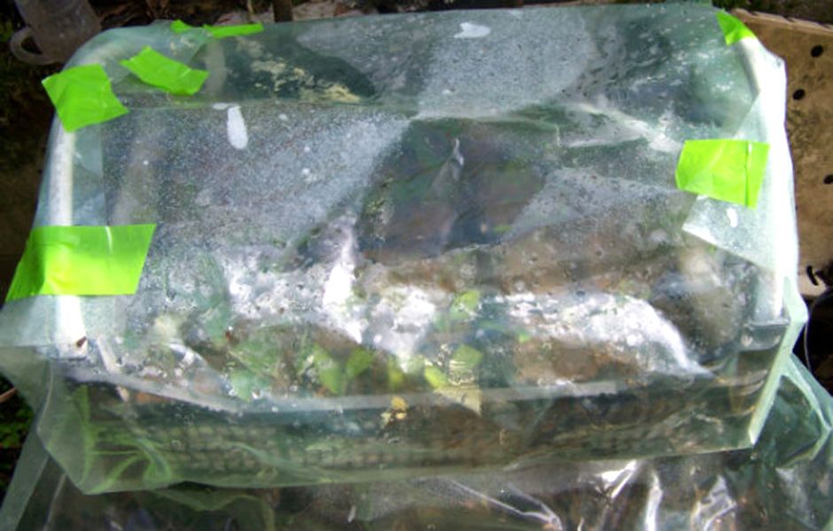 Закрепляю плёнку с боков степлером или скотчем, а край, который смотрит на меня, подворачиваю под ящик, чтобы удобно было его приоткрывать и опрыскивать черенки. А опрыскивать придётся как минимум каждый день. Чем мельче распыл, тем выше приживаемость.